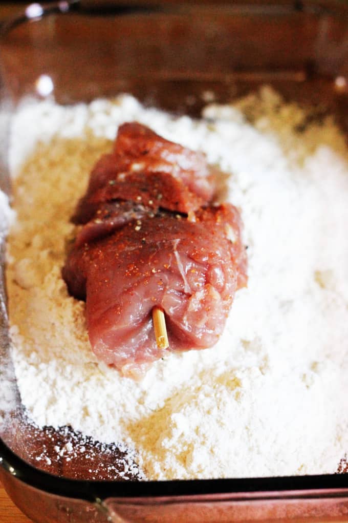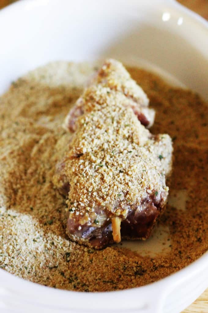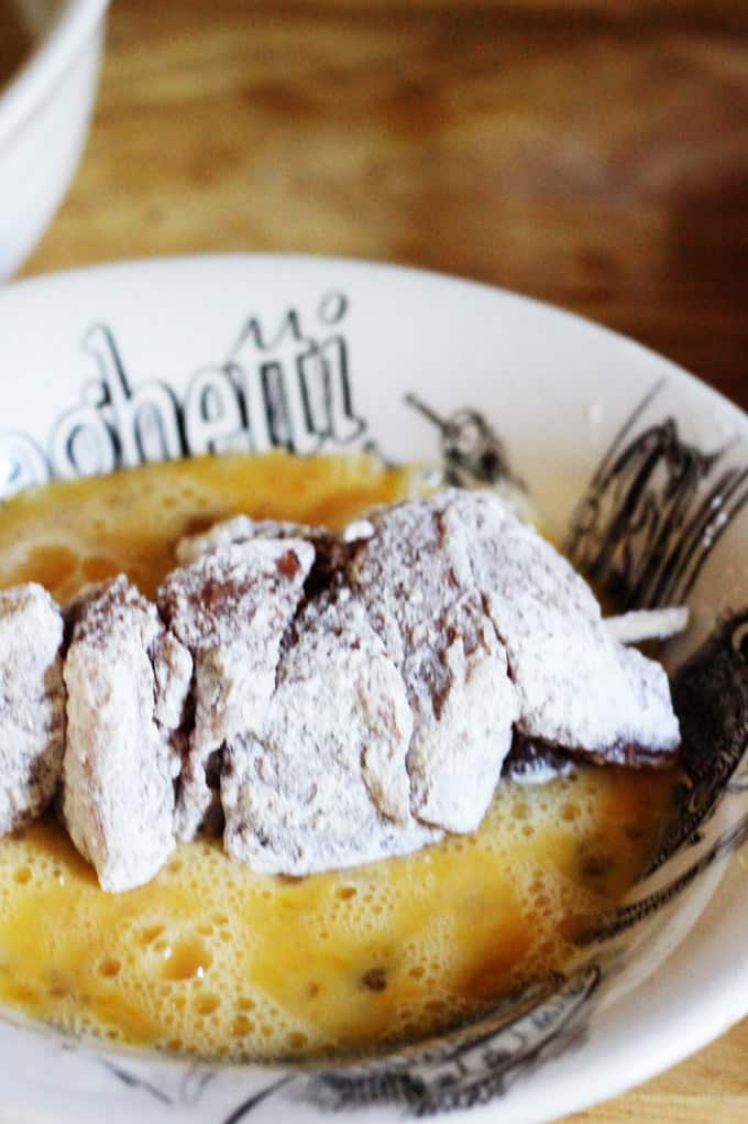 - Prepare 3 prep-dishes: one for flour, one for beaten eggs and one for breadcrumbs. Starting with the flour, cover the meat on each side (shaking off the excess), then place it into the egg mixture and cover on each side. Then finish it up by rolling it in breadcrumbs, on each side. Continue with all the remaining skewers.