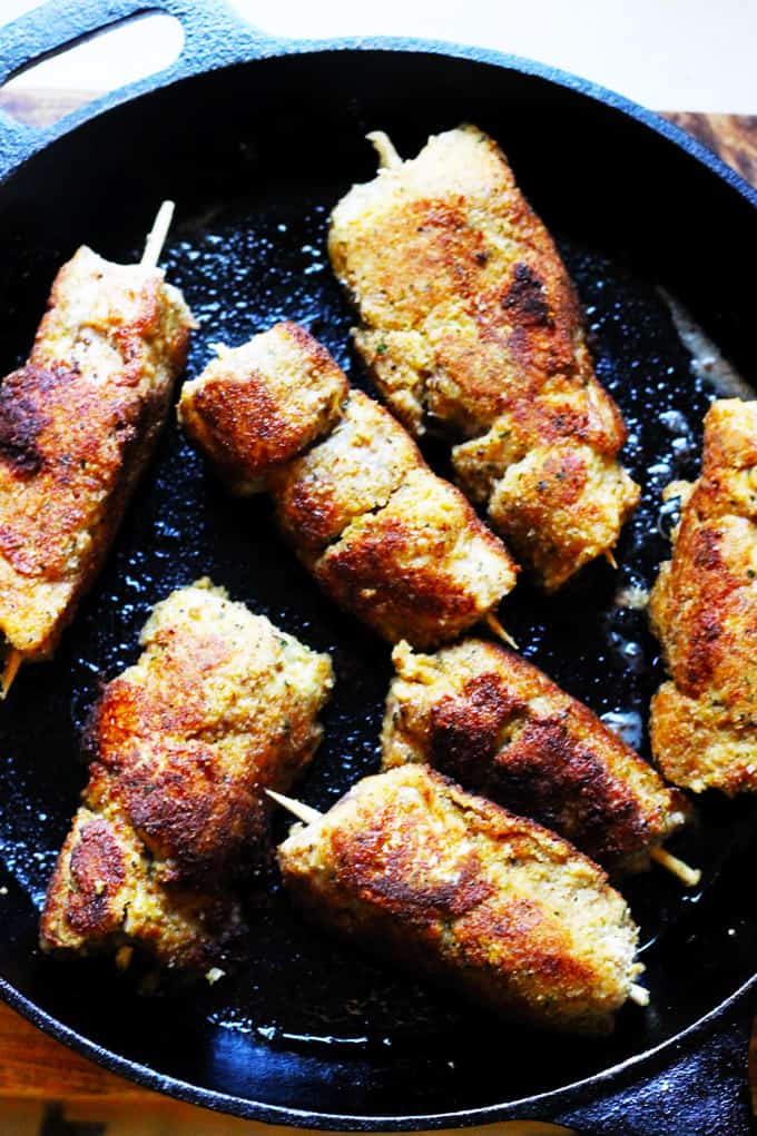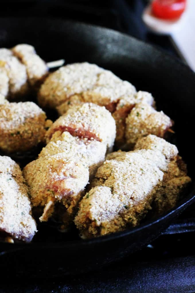 - Frying: heat up your cast iron (or another heavy pan) skillet. Add cooking oil. Once the oil is hot, add breaded skewers into the skillet (don’t overcrowd them, cook in batches if needed). Fry the skewers on each side until golden brown and then transfer to a 350 F hot oven to finish up cooking (covered for 20 minutes and uncovered for 5 minutes). Serve and enjoy!