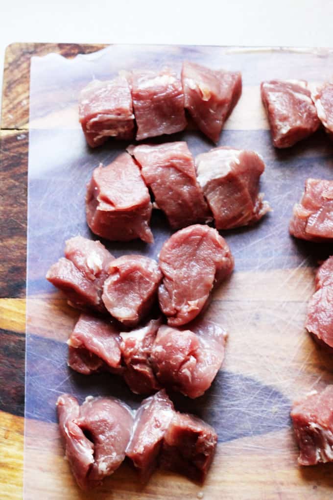 I highly recommend to use pork tenderloin and cut it into cubes. It’s very tender and cooks super quick. Any other cut of pork could become dry or chewy.