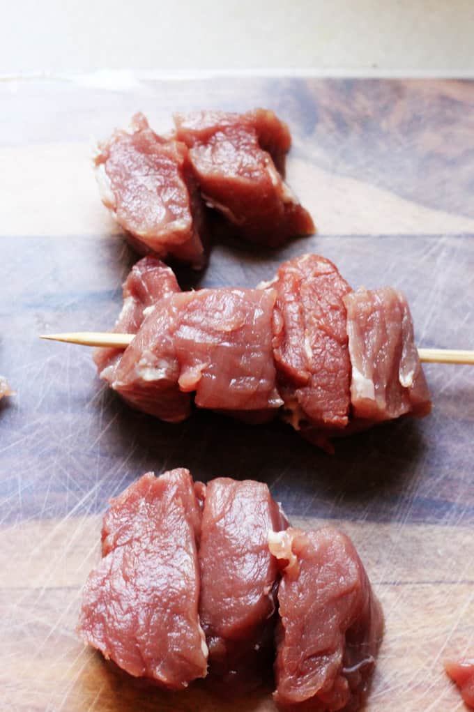- Assemble the skewers: cut your meat into 1.5-inch squares and add 2 or 3 pieces onto a wooden skewer (cut off the skewers to fit the meat); season the meat on each side and prepare for breading.