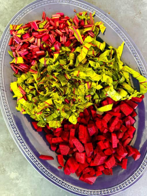 - Prepare the Beets – Separate the beets from their stems, then peel and chop them into small cubes. Wash the green section, then separate the stems from the leaves and chop them both.