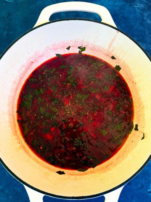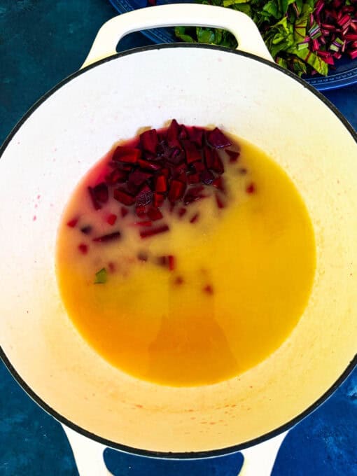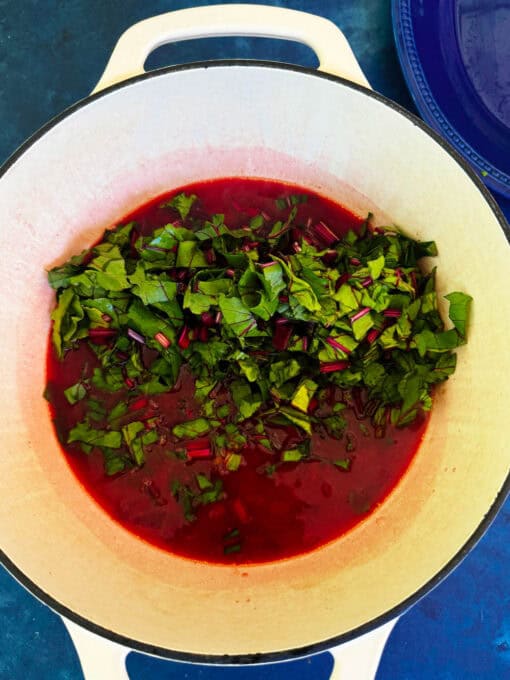 - Boil the Beets – Add the chopped beets to a large pot with the broth or water. Bring to a boil, cover, and cook for 10 minutes. Then, add the stems and leaves and cook for a further 5 minutes. Taste and add salt if needed, then turn off the heat and cool to room temperature.