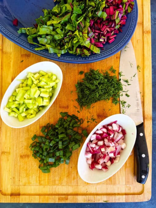- Prepare the Garnish – Dice the cucumber and radishes into small cubes, ensuring they match the size of the beet cubes. Separate them into separate bowls. Next, chop the scallions and dill.