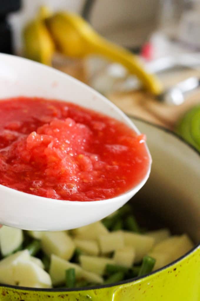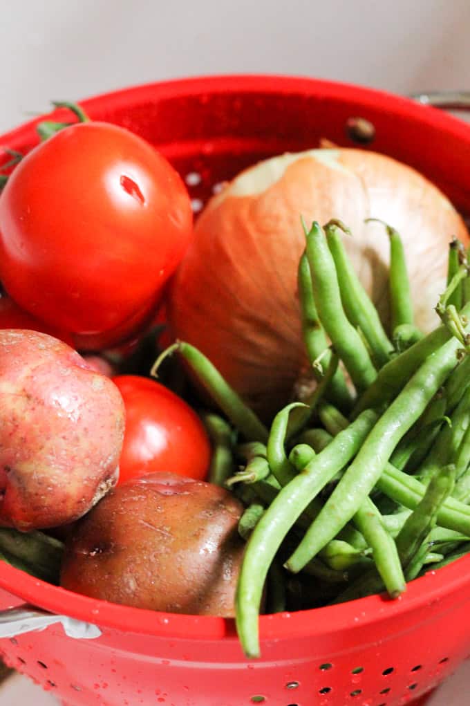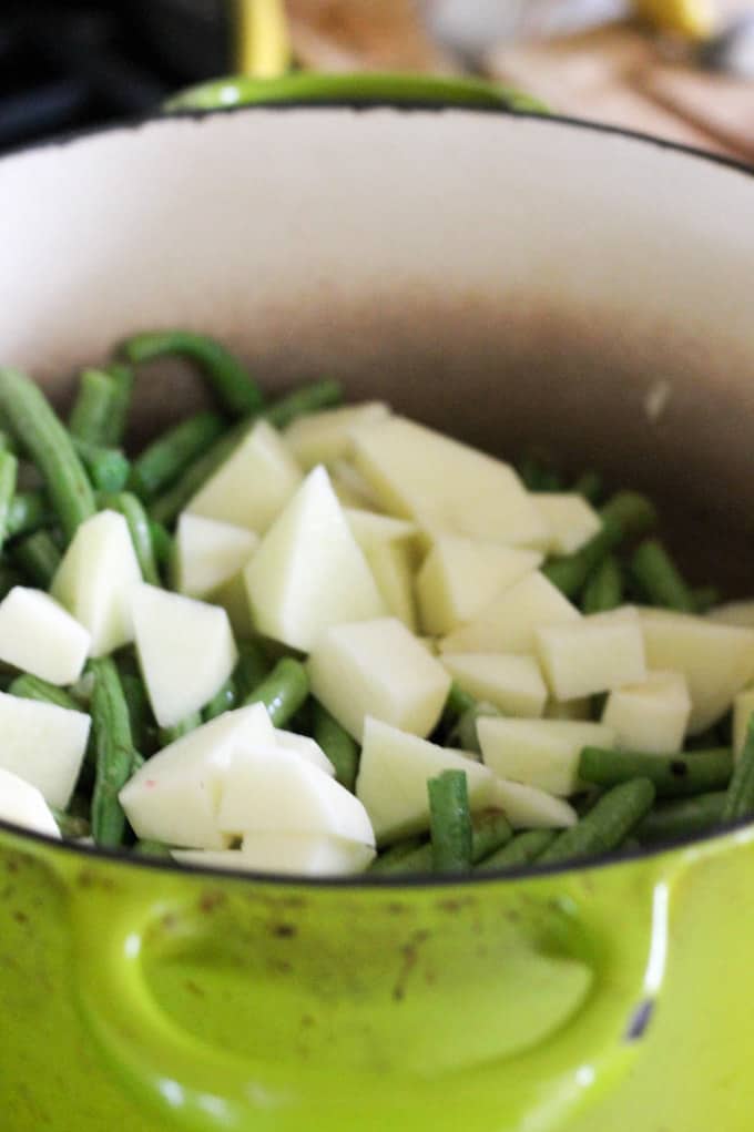 Step 1: Prep your veggies: peel and chop the onions; peel and chop or press your garlic; wash and trim your green beans; peel your potatoes and cut them into squares; shred your tomatoes on a grater with large holes.