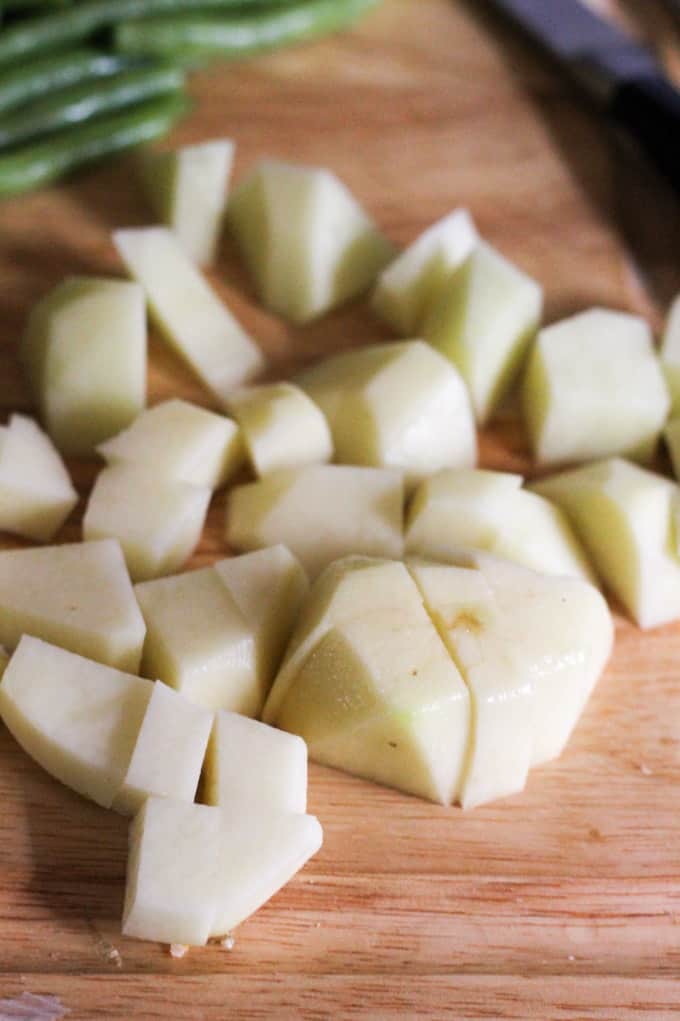 - Prep your veggies: peel and chop the onions; peel and chop or press your garlic; wash and trim your green beans; peel your potatoes and cut them into squares; shred your tomatoes on a grater with large holes.