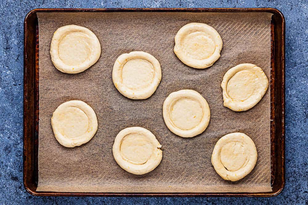 - Move your koláče to the lined sheets and brush some beaten egg along the edges.