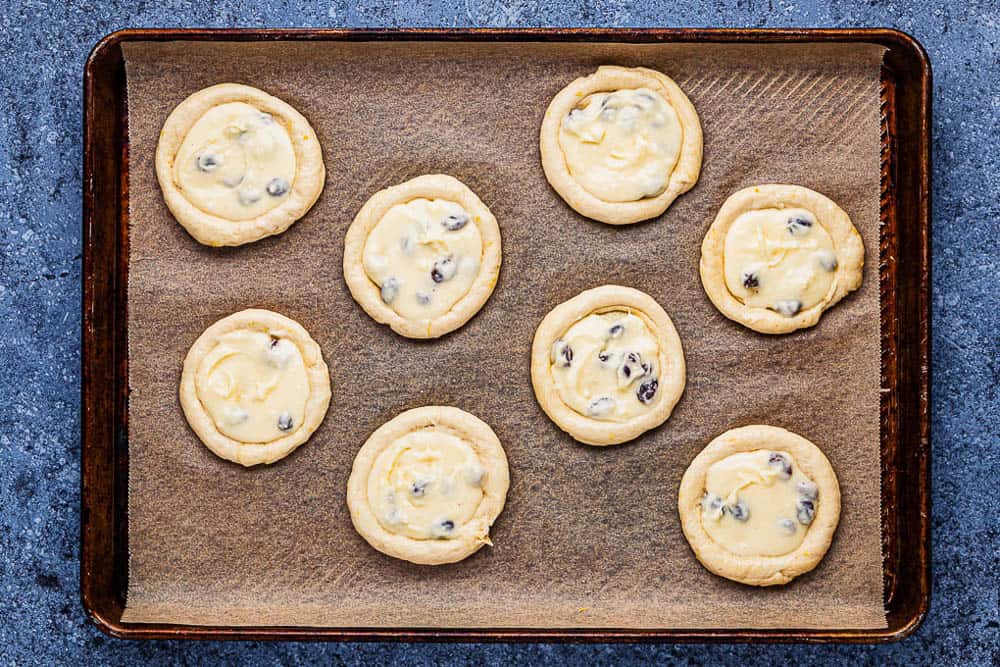 Raisins are added to the fresh cheese filling. Dipping them in rum for a few hours before baking will make the final product even more delicious.
