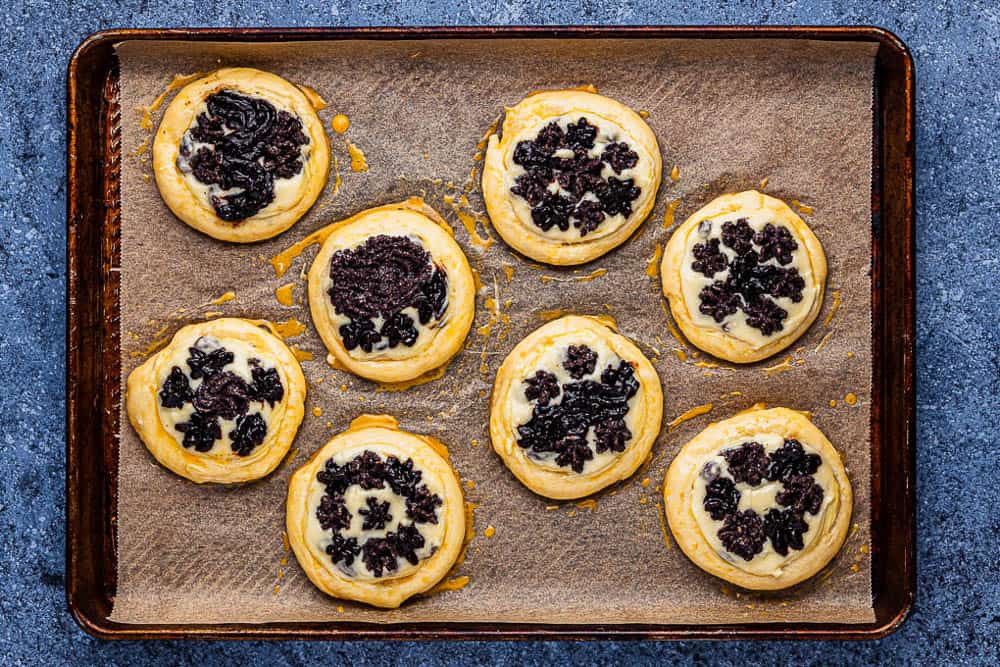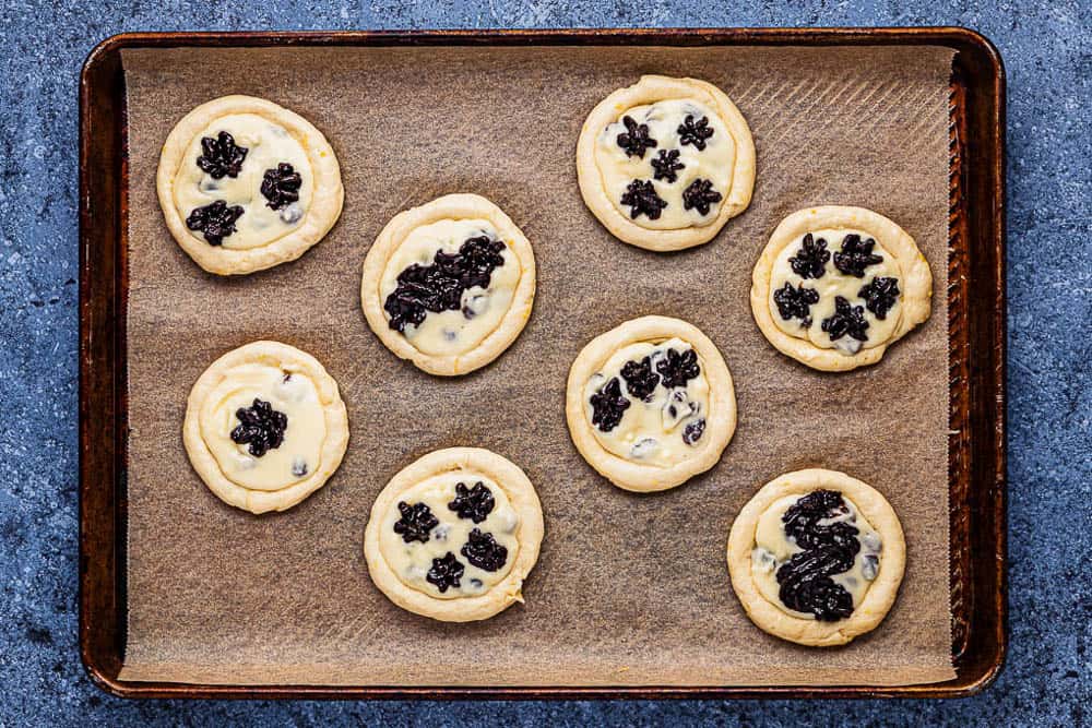 - Place either filling in the middle of each round indentation either using a spoon or a piping bag. You can also combine 2 fillings, the poppy seed filling especially goes very well together with the fresh cheese filling and is a very traditional combination in Czech! You can just spread the filling using a spoon or create circles if using a pastry bag.