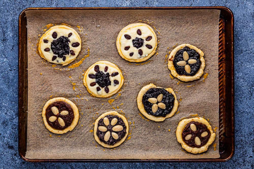 Real koláče are rounded in shape, so make sure they have enough room on the baking sheet. The squared kind, thin on filling that we sometimes see is a result of them being stuffed into a high-sided baking dish with not enough room (and usually not enough filling), so they rose to the top instead of to the sides.