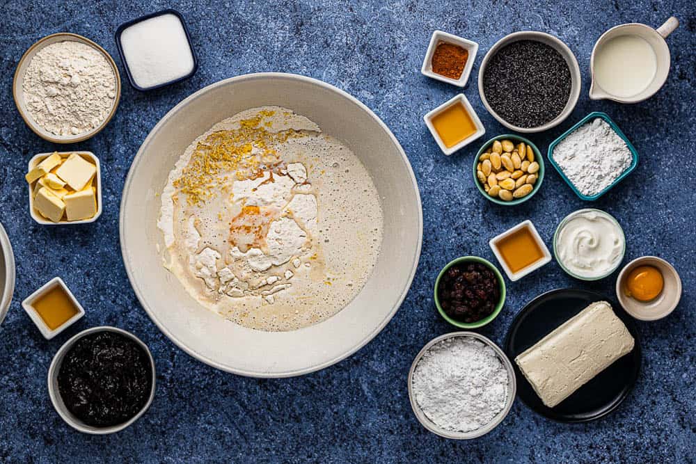 - Sift the flour and salt into a large bowl. Add lemon zest, vanilla, the rest of the sugar, egg yolk, room-temperature butter, and rising yeast mixture.