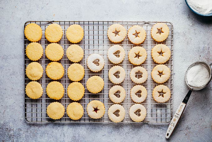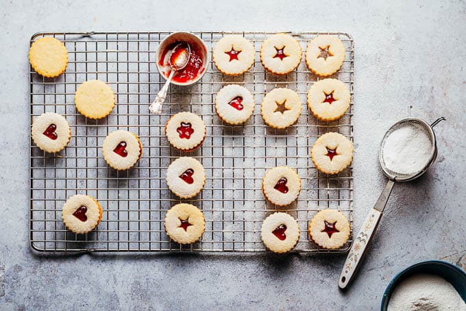 You can bake them up to two weeks before Christmas, and store them in an airtight container, and then fill them with either red currant or raspberry jam a few days before the holidays so that the flavors have time to intertwine.