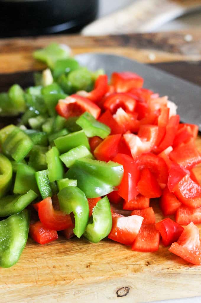 Step 1: Prep your vegetables: chop onions and garlic. Then cut peppers and zucchini into small squares. Parboil, peel and chop your tomatoes (Tip: Paraboiling your tomatoes in hot water for approximately 3 minutes will ensure that the skin will easily peel off)