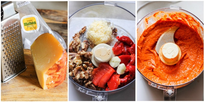 - Make Roasted Pepper Pesto. In a food processor combine roasted peppers, toasted walnuts, shredded Cured Mahon Menorca Cheese, garlic, and extra virgin olive oil. Pulse to combine. Taste for seasoning. Add salt & pepper and process until all ingredients are well combined into a pesto. Set aside.