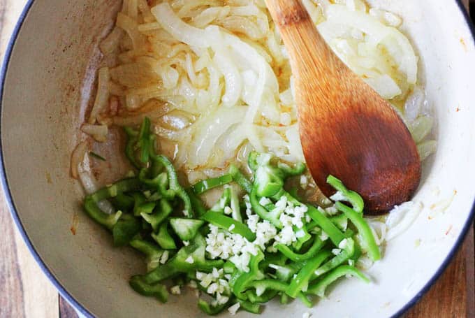 - Add chopped garlic and thinly sliced pepper and cook for 2 – 3 minutes.