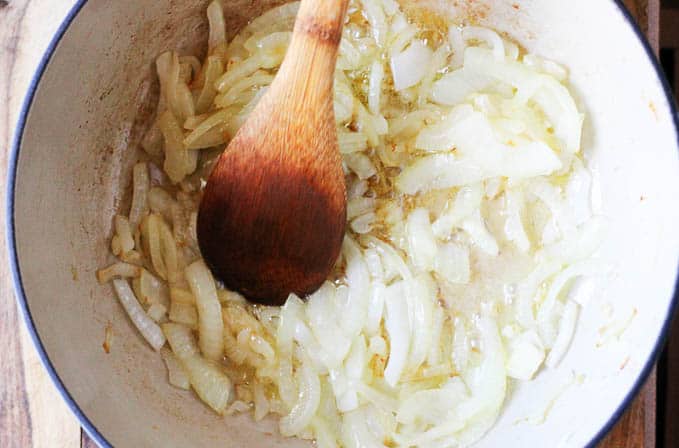 - Sauté your onions. Add either butter, oil or lard into a Duch Oven or a braising pot, sauté the onions for about 8-10 minutes, until nicely soft and almost caramelized.