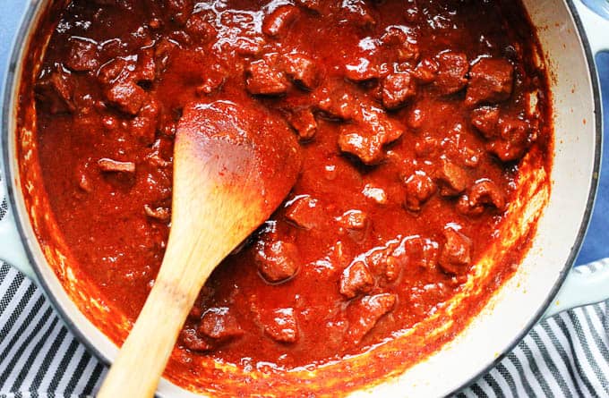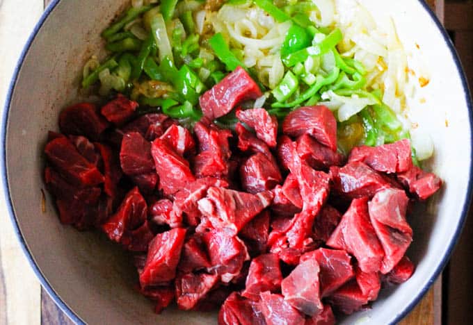 - Add beef. The very distinguishing characteristic of this dish is that the meat is cut into tiny cubes. If you happen to buy beef stew meat at your grocery store, you’ll have to dice the cubes into smaller chunks. Once you add the beef to the pot, cook it for about 5 minutes, until no longer pink.