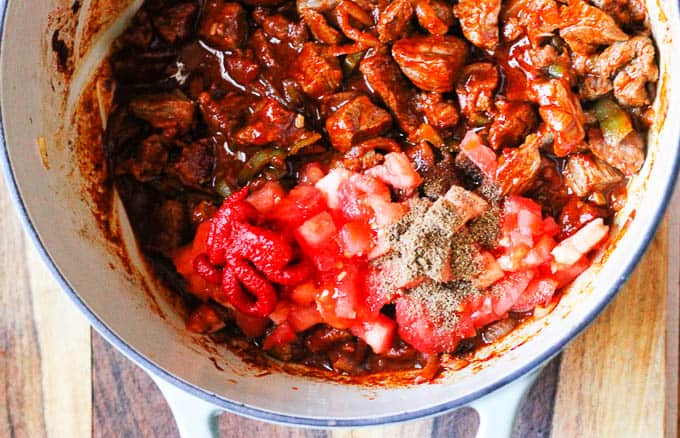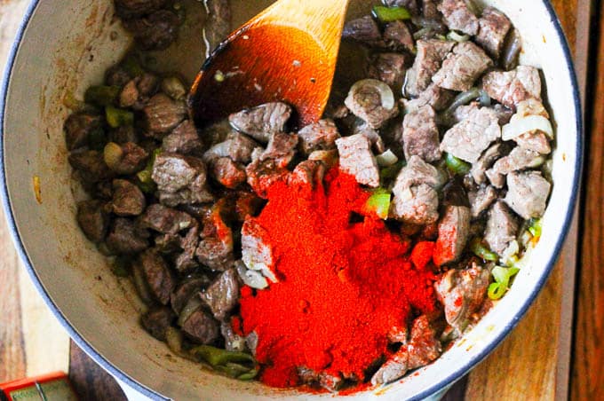 - Add Hungarian Paprika and tomatoes. This is a very important step that can make or break your Pörkölt! Paprika can burn easily and if you let it cook for too long it will become bitter and your beef stew won’t taste as good. So, I suggest you just add the paprika and mix it well – so that it covers the meat and veggies. Then add tomato and/or tomato paste if using, mix it again and move on to your liquid base.