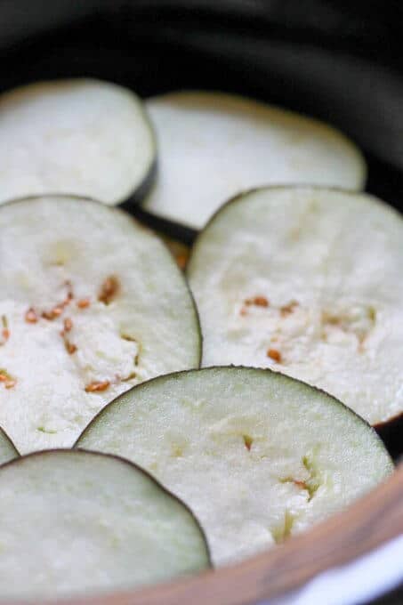 It’s super simple. You’ll need to slice up the eggplant first and salt them on one side – wait 10 minutes – turn and salt on the other side – wait another 10 minutes – rinse it, and you are ready to assemble your Slow Cooker Lasagna. I provide a detailed description with step by step photos in the recipe below.