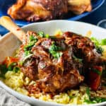 • Carefully remove the pot from the oven using protective mittens. Remove the shanks and check if your sauce is reduced enough. If not, put it on the stove and cook uncovered for another 10-15 minutes to thicken the sauce.