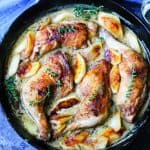 Chicken Normandy, also known as 'Poulet á lá Normande,' is a super delicious, fall, French Chicken dish. It is whole chicken legs braised in apple cider and brandy; then cooked with onions, garlic, and herbs, and finally finished off with cream, dijon mustard, and fried apples. It's luxurious, has that definite "Wow" factor both in look and in taste - yet it's easy to make.